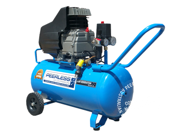 Compact powerhouse: 175L/min free air. outlet: water trap filter regulator. Peerless direct drive pump, 1-year warranty. Impressive performance in a compact design.