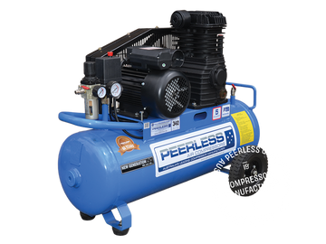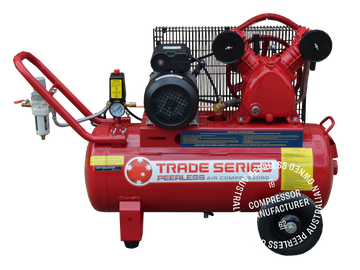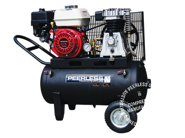 Ultimate performance: 340L/min free air. Dual outlets: water trap filter regulator, direct tank pressure. Peerless cast iron pump, 5-year warranty. Impressive performance with reliability.