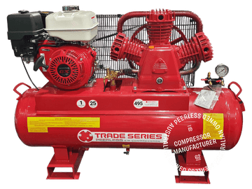 Compact commander: 495L/min free air. outlet: water trap filter regulator. Cast iron pump, 1-year warranty. Impressive performance in a compact design.