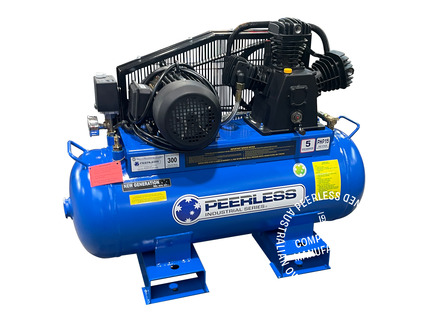 Truckie's mate: 300L/min free air at high pressure. Peerless cast iron pump, 5-year warranty. Impressive performance with reliability.