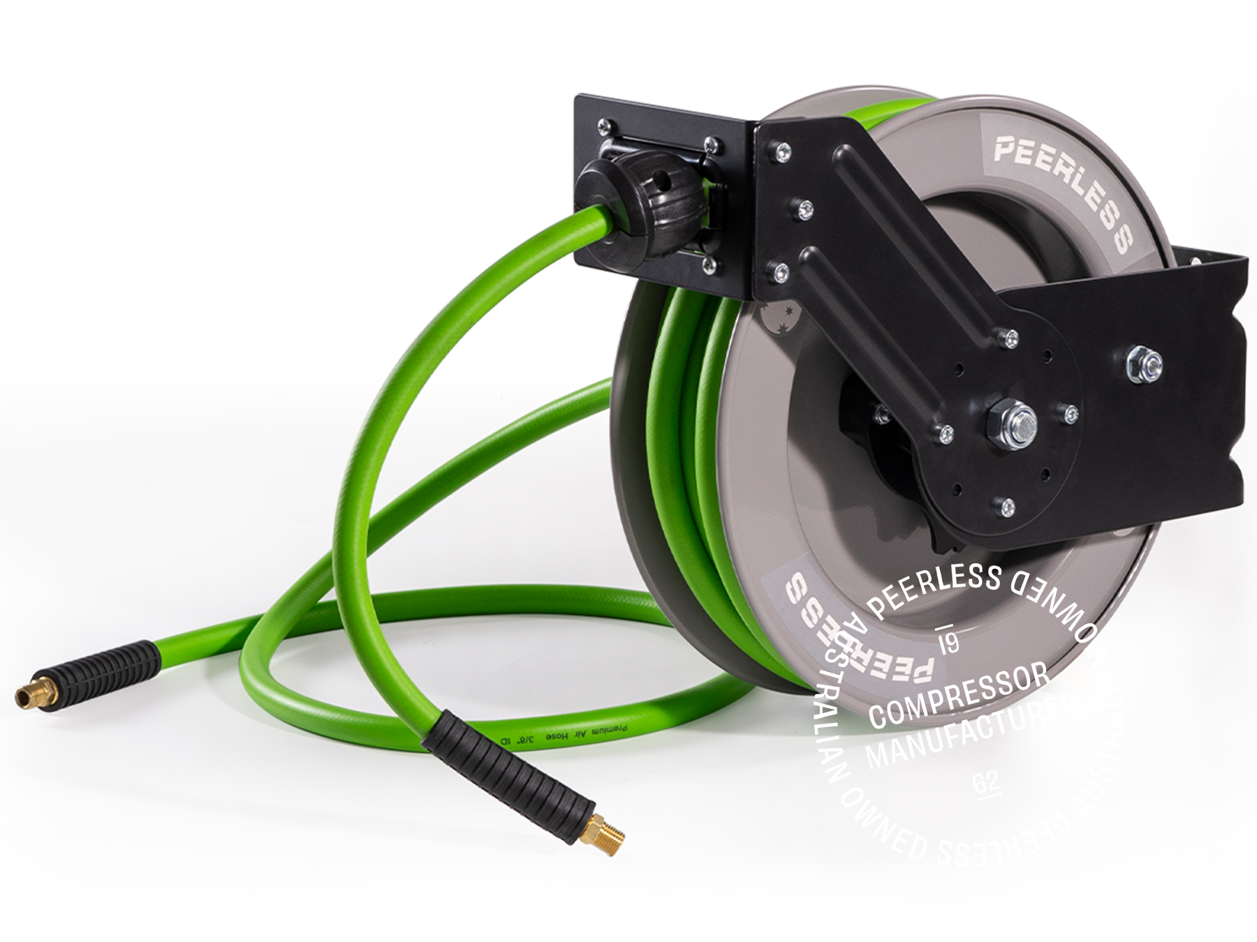Peerless' industrial metal retractable air hose reels have been upgraded to a new super heavy duty design. The mounting bracket has been thickened right through to the retracting spring making it tough and durable.
